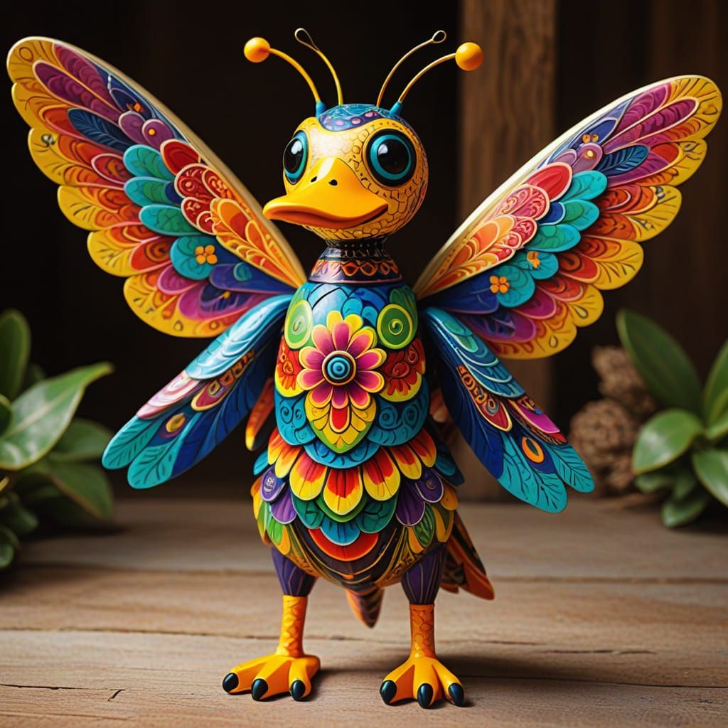 This image showcases a colorful wooden alebrije sculpture of a fantastical bee-duck hybrid, intricately patterned and textured with glowing eyes, set against a warm golden glow