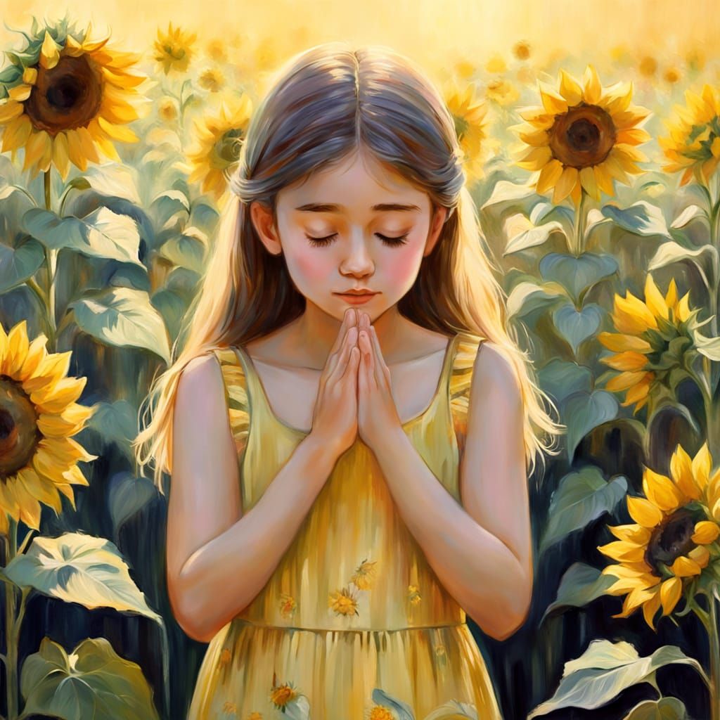 This image shows a young girl in a yellow sundress praying in a field of sunflowers. The impressionistic style uses soft focus, delicate brushstrokes, and a warm, golden, pastel color palette.