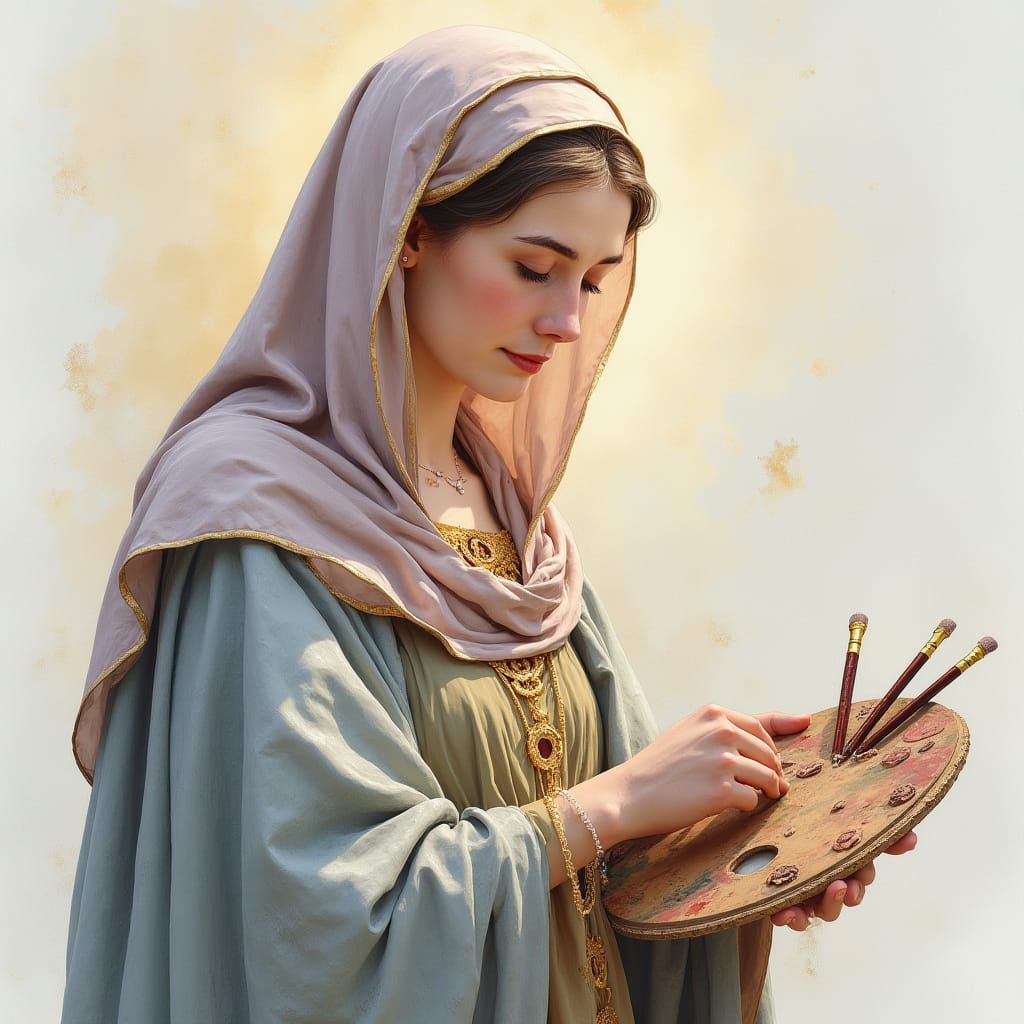 This image is a beautiful, Impressionist-inspired watercolor portrait of St. Catherine of Bologna, surrounded by subtle light and elegant, flowing robes, with intricate folds and textures reminiscent of the Old Masters.