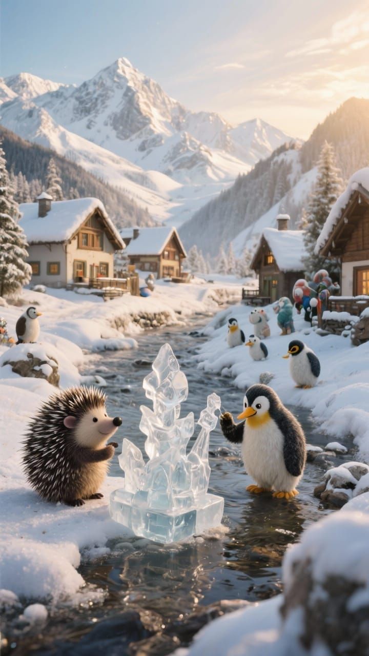 This image depicts a hyperrealistic Alpine village with unique inhabitants: hedgehogs and penguins creating ice sculptures. Features include snow-capped mountains, clear streams, and cinematic golden hour lighting.