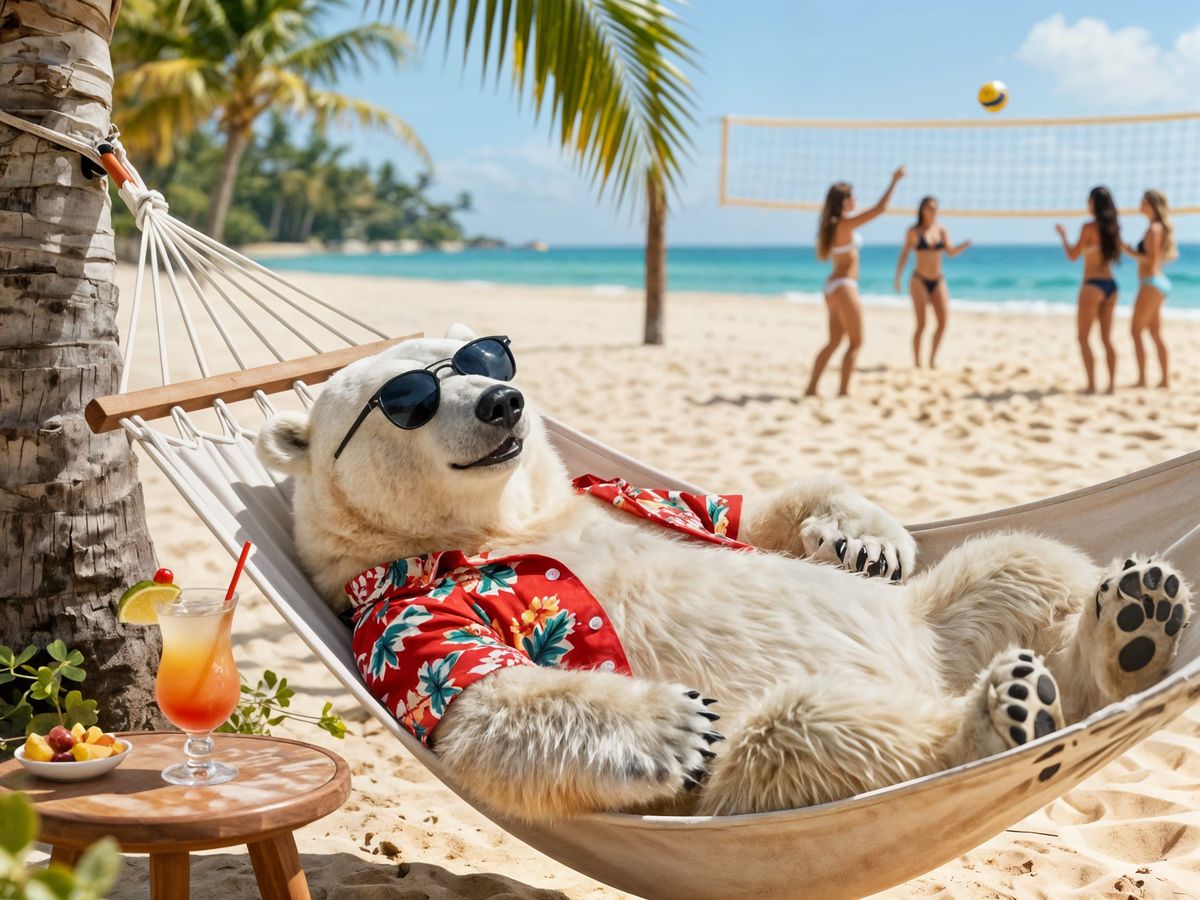 This image shows a joyful, anthropomorphic polar bear relaxing in a hammock on a tropical beach. It wears a floral shirt and sunglasses, with a cocktail nearby.