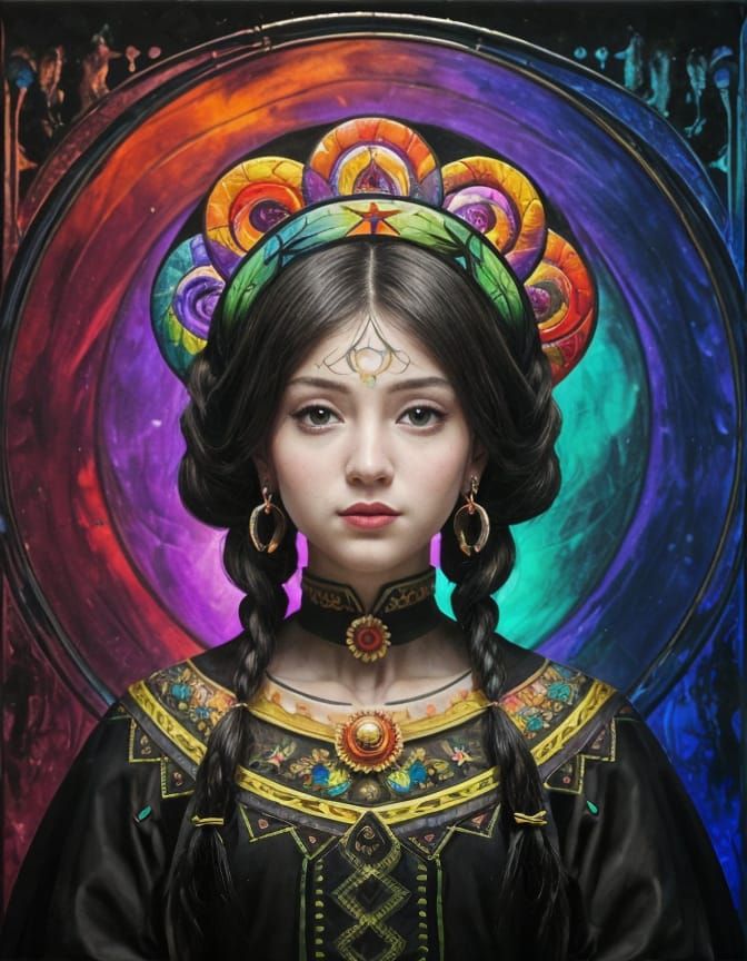 This image features a goddess with giant ribboned braids and a fractal gown in a surreal, stained-glass inspired landscape, rendered with thick, textured oil brush strokes.