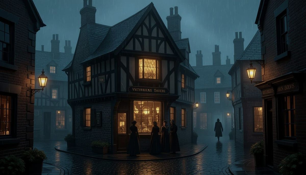 "Victorian era glowing tavern window on a rainy night Narrow medieval cobblestone foggy alleyways lit by lanterns Victorians gathered outsid...
