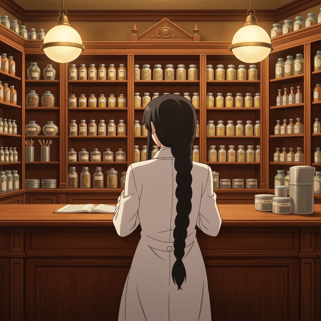 This image depicts an old Italian pharmacy with shelves full of herbalist jars. A woman with braided black hair sits at the counter, bathed in warm, soft light, in a beautiful anime art style.