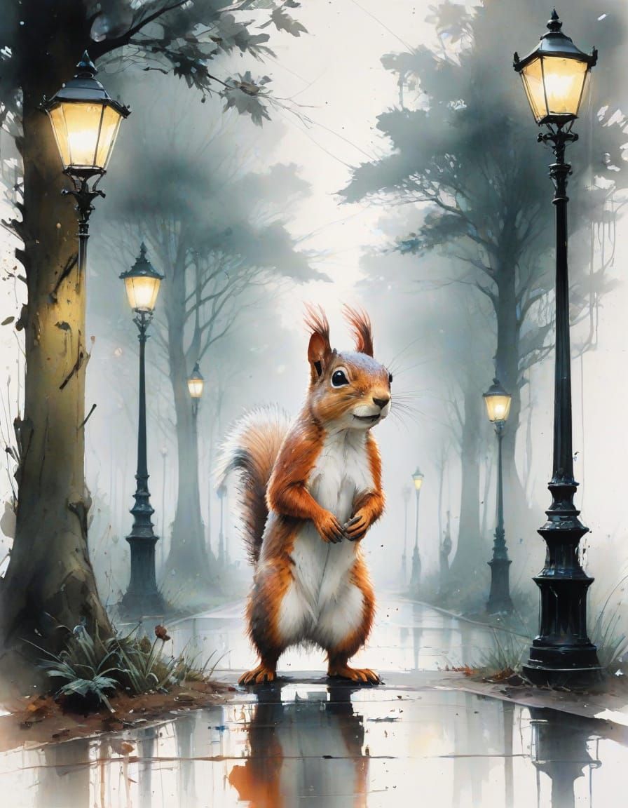 A vibrant park scene at night with a squirrel running along a winding path. The image blends old streetlamps with neon lights in a watercolour aesthetic.