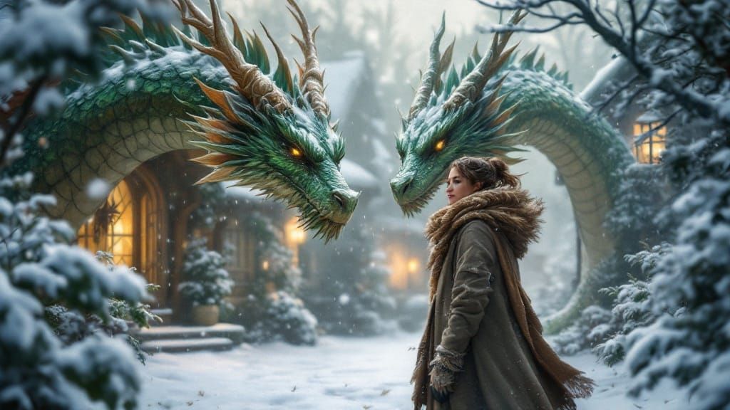 A serene German maiden stands amidst gentle snowfall, surrounded by friendly green dragons, in a cozy cottage setting, evoking a sense of tranquility and wonder, reminiscent of classic storybook illustrations with intricate details and soft, ethereal lighting.
