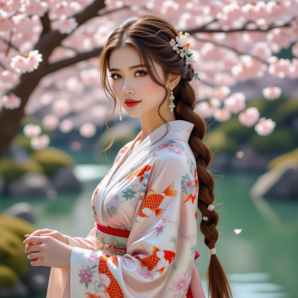 A captivating image of a woman with long auburn hair, styled with braids and jewels, in a cherry blossom garden. She wears a shimmering gown with koi and mythical embroidery, as photorealistic digital art.