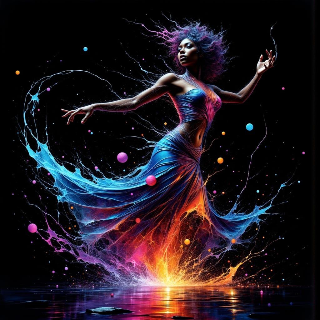 A striking picture of a powerful, dark-skinned woman dancing in the void of space. She's a radiant figure of neon light, moving with raw intensity in a dark and vibrant display.