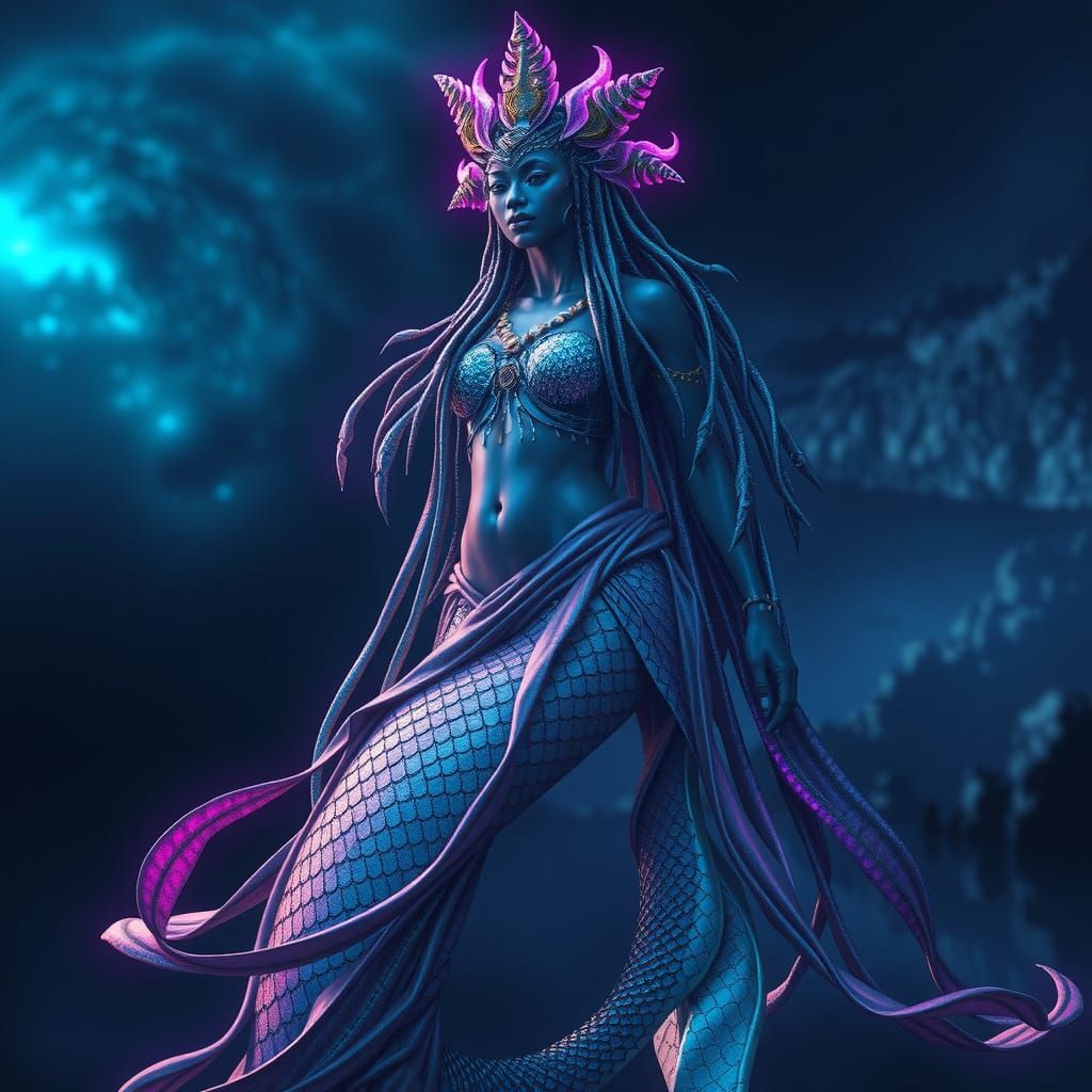 This image depicts Mami Wata, the African water goddess, as a futuristic mermaid, surrounded by soft, volumetric lighting and cool, noctilucent hues, evoking a sense of mysticism and wonder.