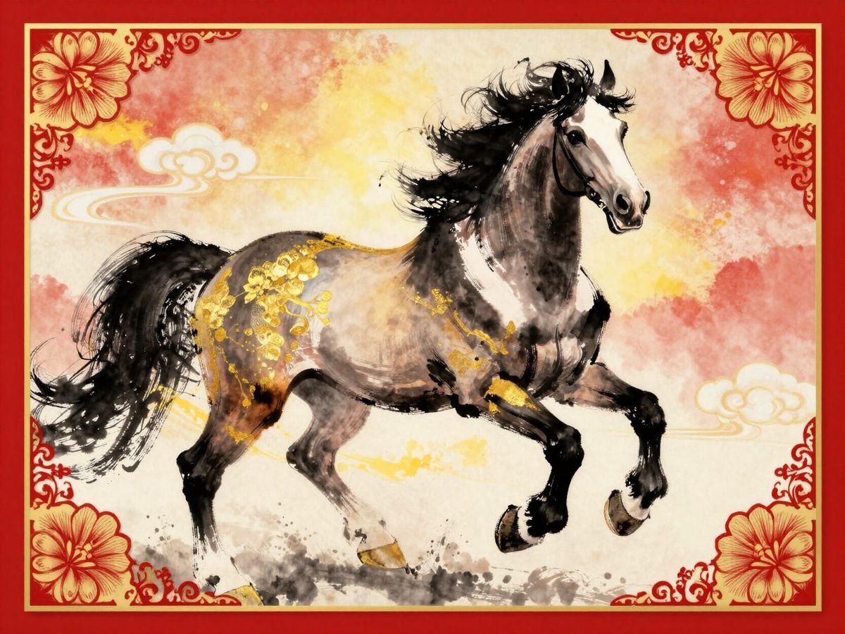 A dynamic Chinese ink painting of a galloping horse, framed by floral patterns and clouds. Features bold brushstrokes and vibrant crimson and gold hues, symbolizing good fortune and a new year.