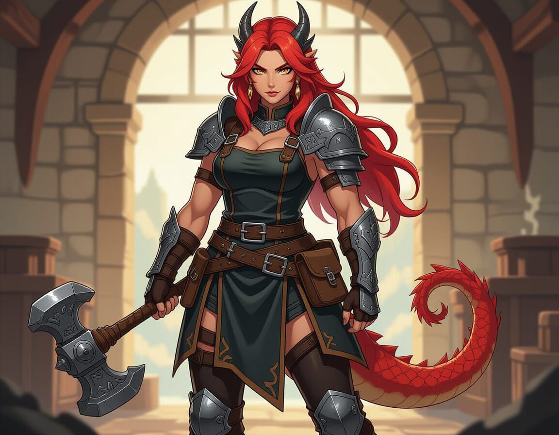 A striking picture of a dragon woman blacksmith. She has a muscular build, wears a leather apron and wields a warhammer. The art style is cel-shaded with cinematic lighting, blending fantasy and sci-fi.