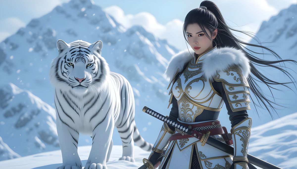 A hyperrealistic image of a woman in white and gold armor with a katana, standing on a snowy peak beside a majestic white tiger. Cinematic, moody atmosphere with falling snow.