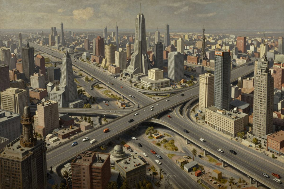 A detailed oil painting of a realistic, post-industrial city with complex roads, accurate vehicles, and diverse buildings. Features chiaroscuro lighting and an earthy palette, evoking classical urban etchings and industrial realism.