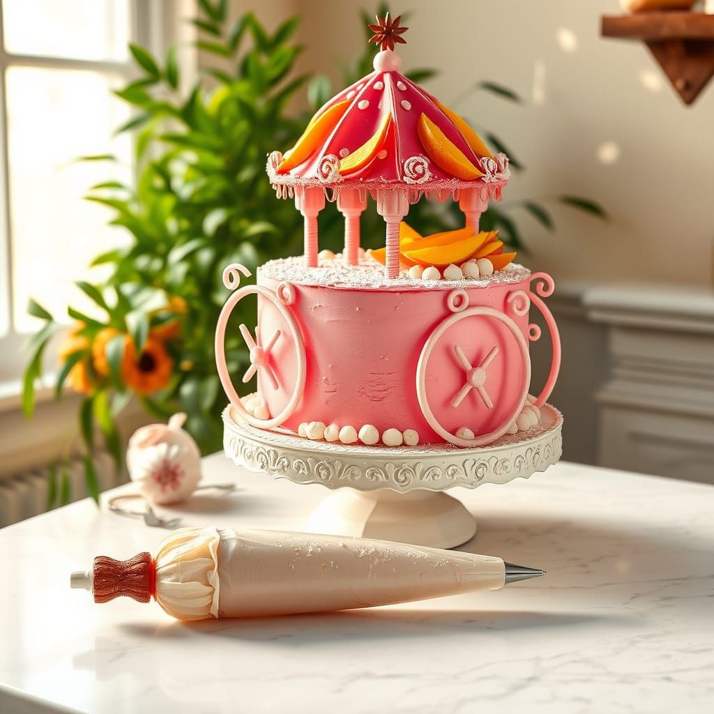 This beautiful cake is a masterpiece of texture and color, featuring a smooth sponge cake base, fluffy cream topping, and vibrant mango slices. Adorned with delicate piping and a sprinkle of powdered sugar, this cake is a work of art reminiscent of Impressionist and Baroque styles.
