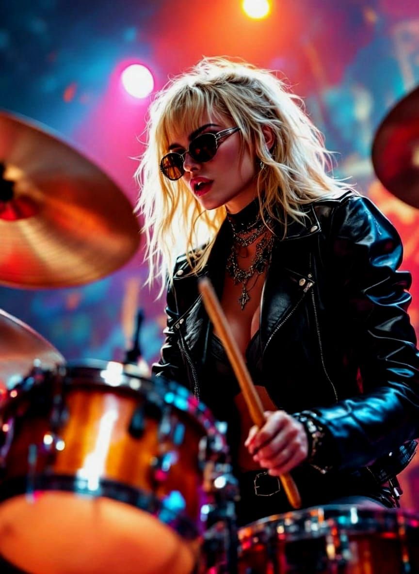 A hyperrealistic image of a blond rock chick energetically playing drums on a stage. The art features splash and concept elements with dramatic lighting.