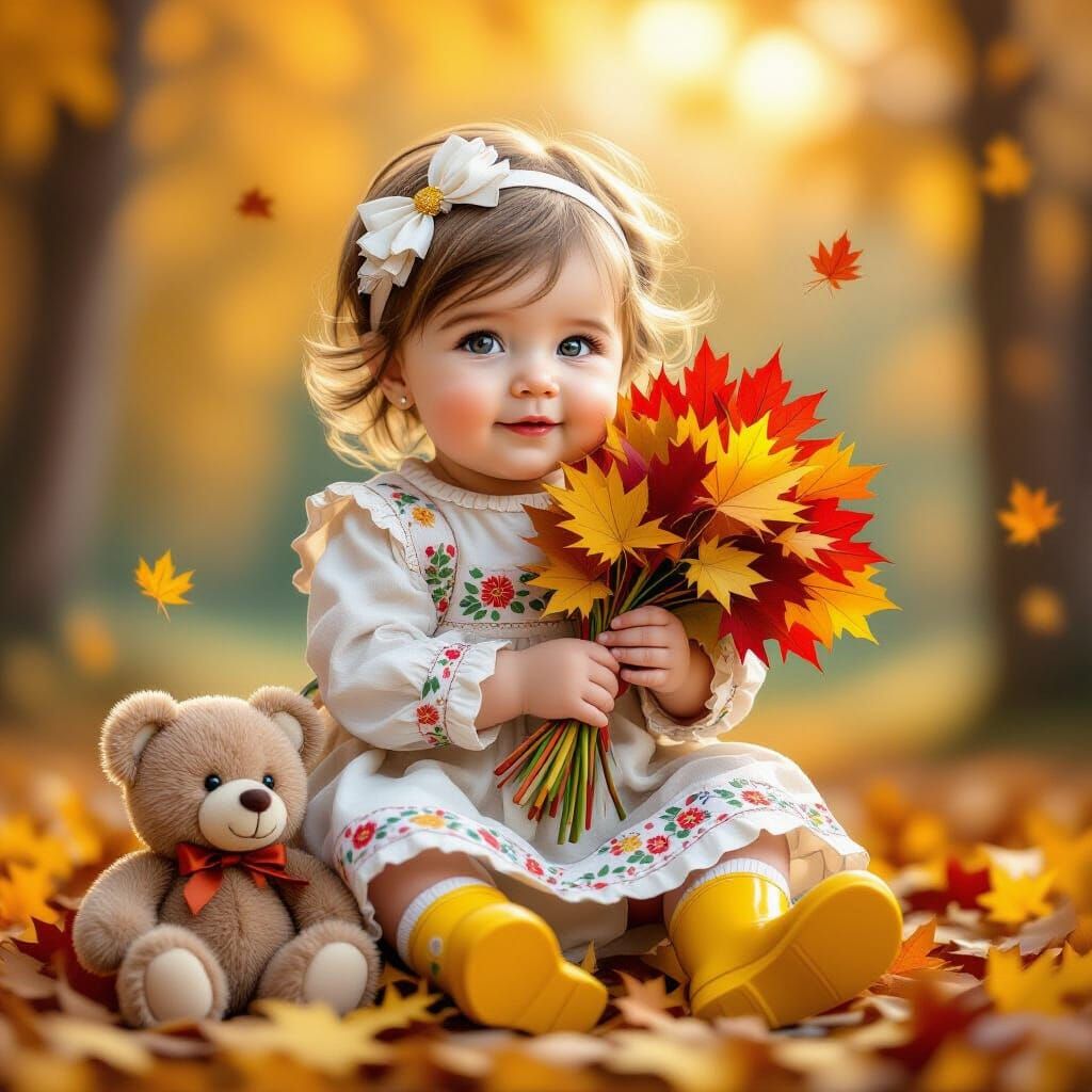 This hyperrealistic image features a kitten in a detailed dress and yellow boots, holding autumn leaves. A toy bear sits nearby, with dramatic side lighting and a colorful background.