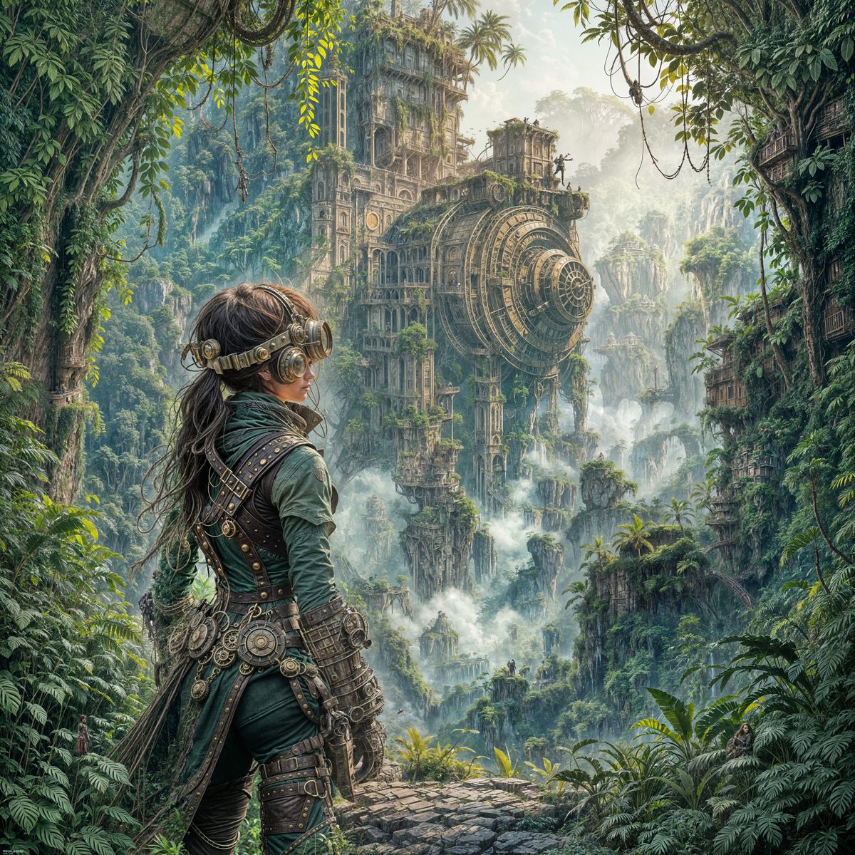 This image depicts a lone explorer in detailed steampunk gear overlooking a vast, vine-covered ruin within a misty jungle. Sunlight pierces the canopy, highlighting ancient machinery in a vivid green and gold color palette.