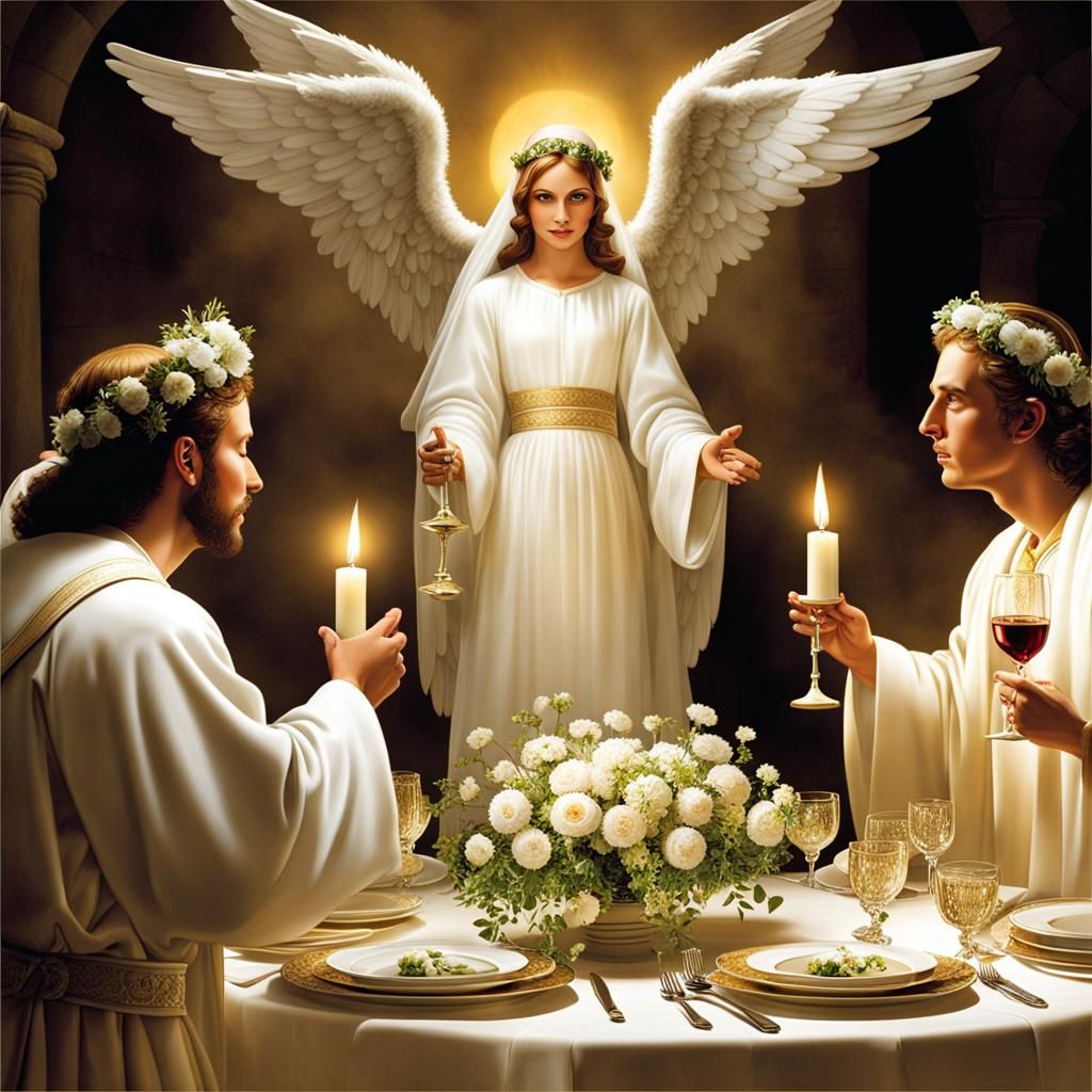 This image depicts a heavenly scene reminiscent of biblical art, illustrating a divine message being delivered by an angel. The artwork evokes a sense of reverence and sacredness.