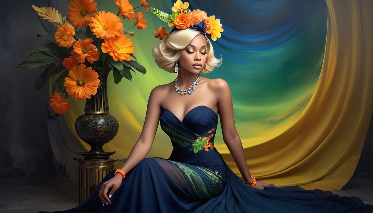 A striking picture of an elegant woman in vintage attire. The surreal and detailed portrait features warm yellows and deep blues, enhanced by bokeh and mist effects. The artwork has a timeless feel.