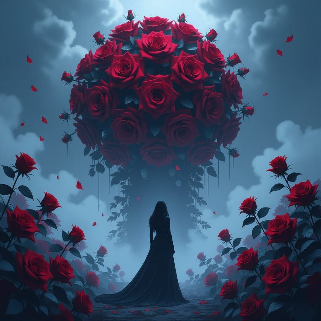 This image shows a solitary woman amid dark crimson roses at night. The digital artwork evokes a dark, elegant aesthetic with neon highlights and whimsical undertones.