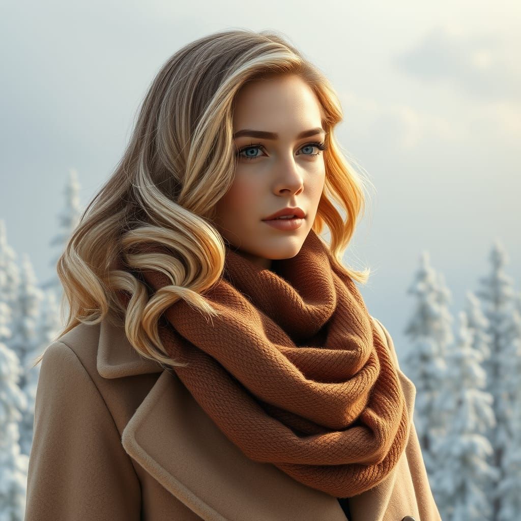 A woman stands elegantly in a serene snowy landscape, her honey-blonde hair styled in loose waves, paired with a luxurious coat and earth-toned scarf, set against a misty pale blue sky with frosty trees, in a photorealistic 8K image with intricate details and deep colors, reminiscent of fantasy concept a...