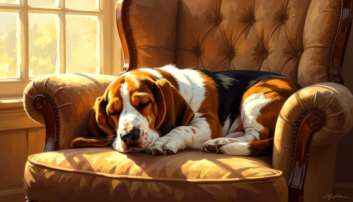 This image depicts a serene Basset Hound resting on an antique armchair, bathed in warm sunlight. The scene evokes a cozy, peaceful atmosphere, rendered in an impressionistic painting style with soft focus.