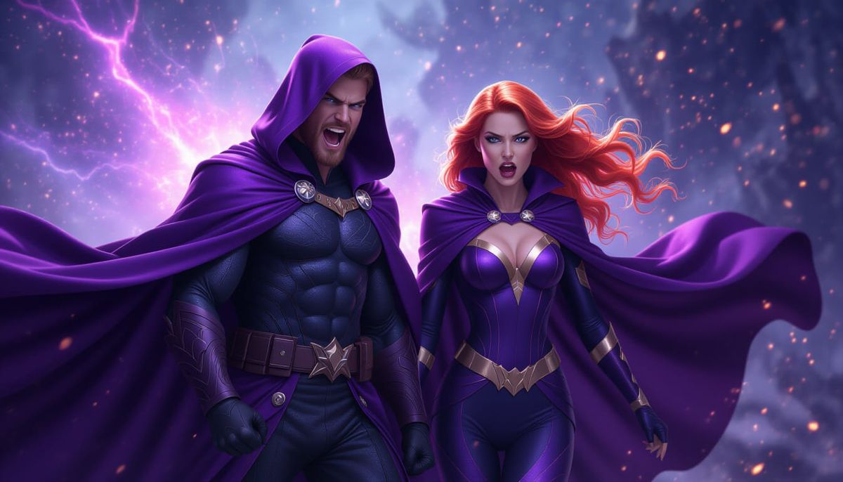 A dynamic image of celestial figures with faces obscured, clad in nebula-inspired costumes and dark purple cloaks, conveying intense emotion amidst crackling cosmic energy, presented with a cinematic, high-contrast aesthetic.