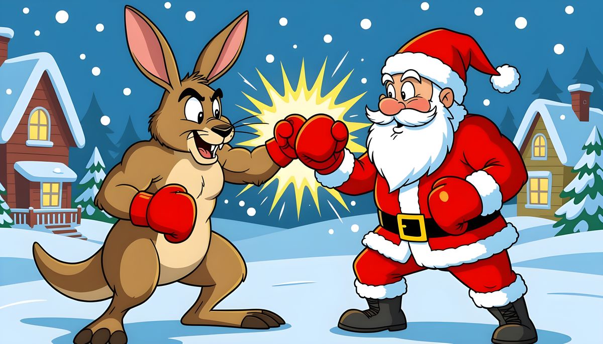This humorous cartoon image depicts a boxing kangaroo and Santa Claus engaged in a playful fight, both sporting red boxing gloves. A festive and funny holiday scene.