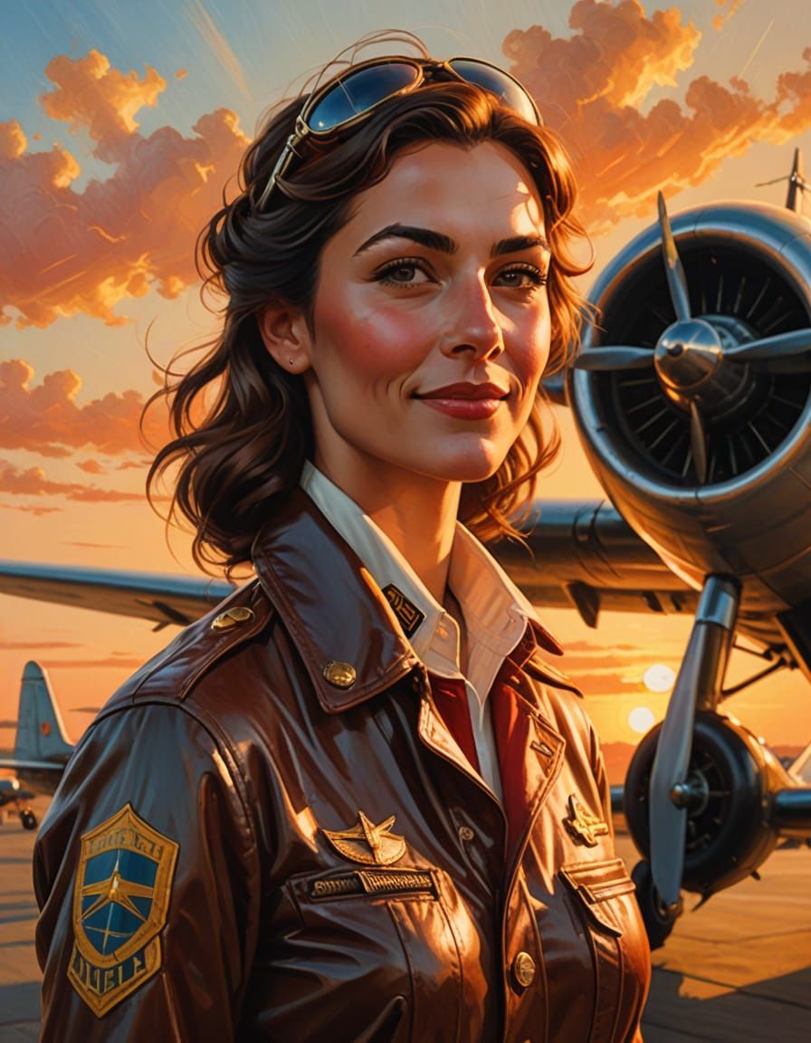 This image shows an athletic Italian woman pilot standing confidently by a vintage airplane during a golden hour sunset. Rendered as a vibrant oil painting with bold colors and strong brushstrokes.