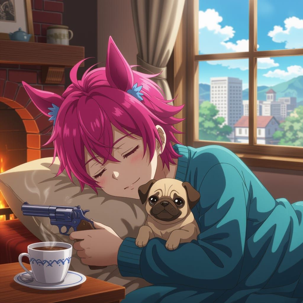 This image shows a mystical anime boy with pink hair and horse ears, sleeping with a pug puppy. The scene features a cozy room, city view, and morning coffee, rendered in a Studio Ghibli-inspired art style with beautiful natural lighting.