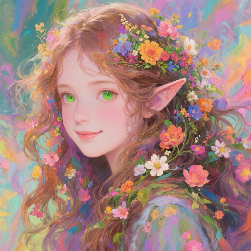 A vibrant portrait of a young elven girl whose hair is a cascade of blooming flowers. Her eyes are hazel green . slight smile. The background is a abstract wash of colors, creating a dreamy and exciting atmosphere. The style is highly painterly with magical realism.