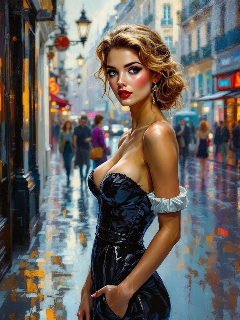 This image shows a figure study in an encaustic style, reminiscent of impressionist paintings. The subject makes direct eye contact in a classic pin-up pose on a Paris street.