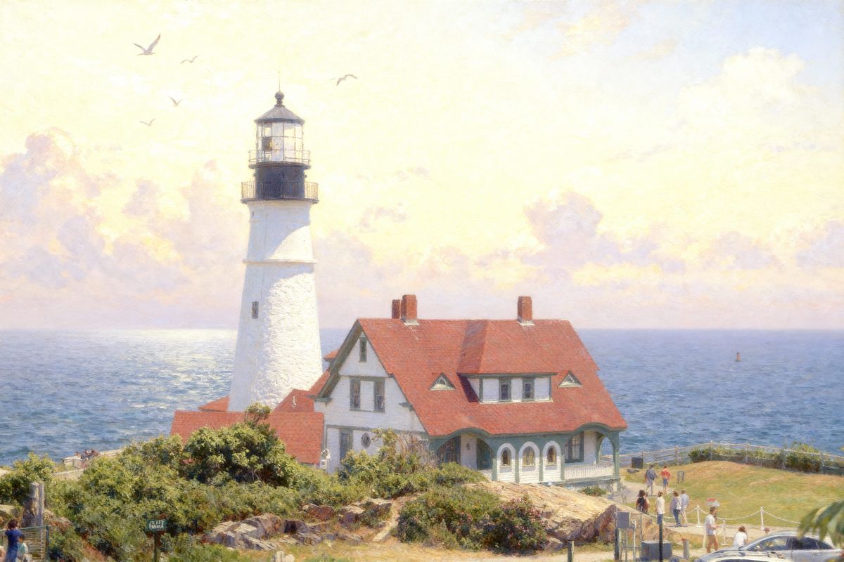 This image features Portland Head Lighthouse in the distinct, idyllic style of Thomas Kinkade paintings. It captures the iconic structure with light clouds and birds, free of people and signs.