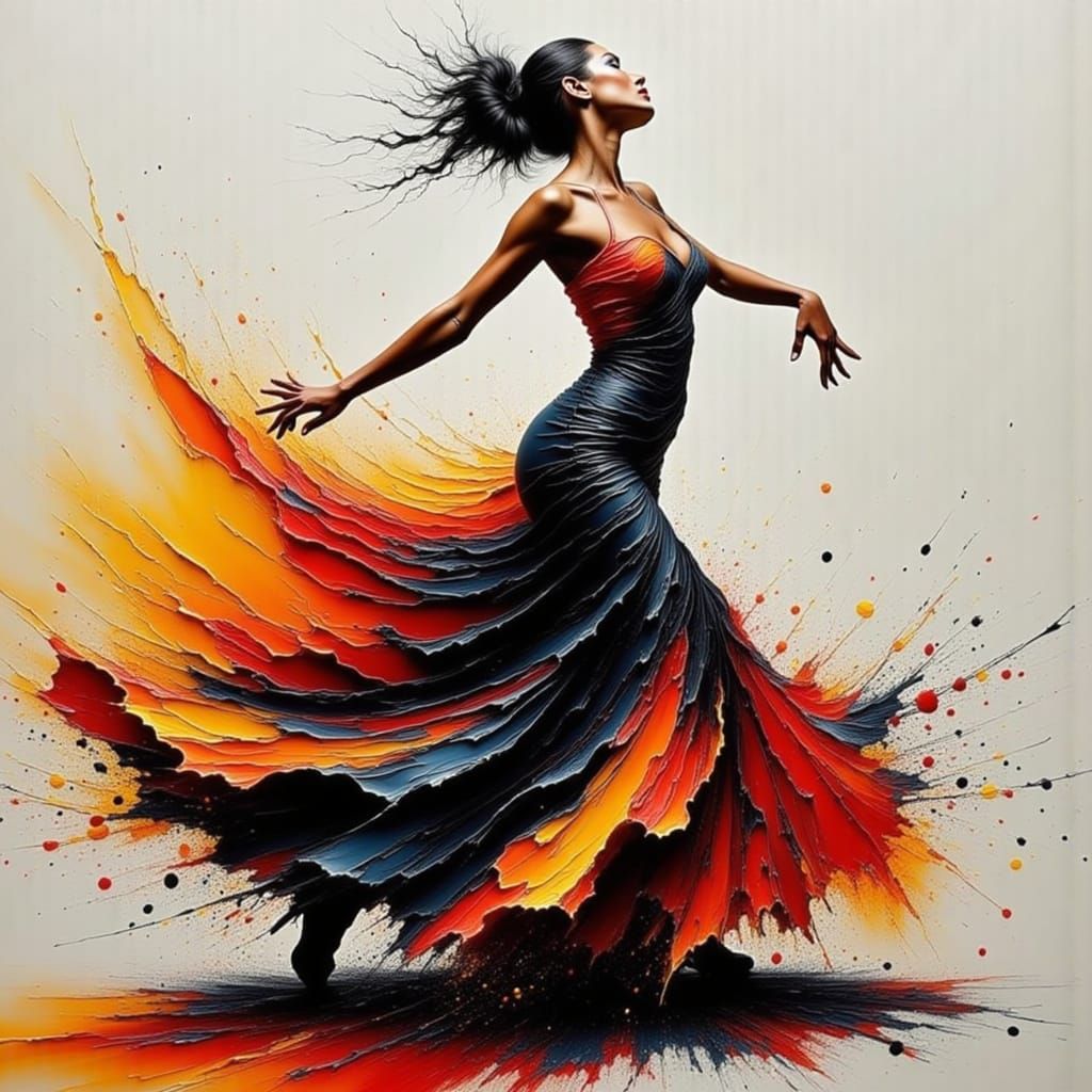 Electrifying, contemporary figurative artwork of a flamenco dancer in an intensely energizing dance. The piece shows powerful freedom of movement and gestural brushstrokes. The style is bold and raw, featuring a mixed media combination of rich charcoal and ink textures, urban aerosol spray. The palette ...