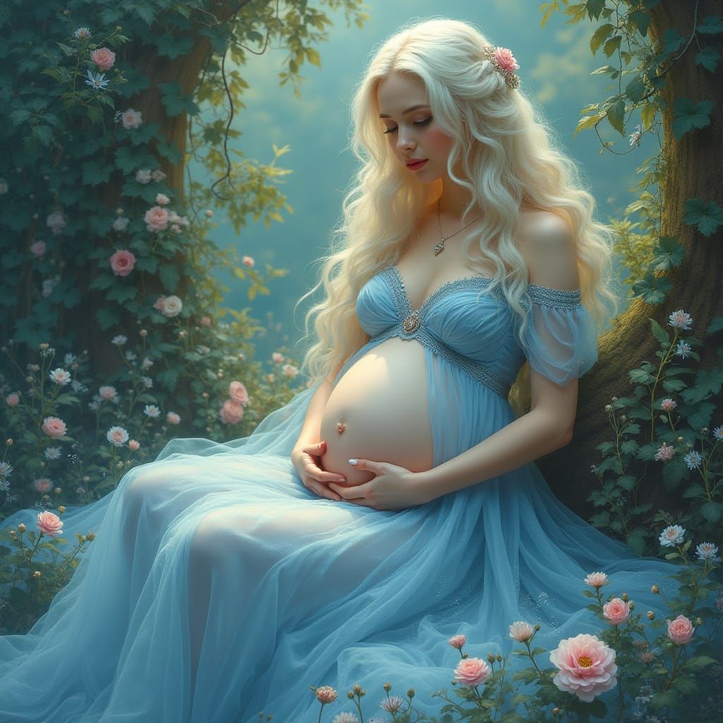This image depicts a serene, pregnant princess surrounded by lush flowers and delicate vines in a dreamlike environment, evoking the Pre-Raphaelite style with soft, romantic lighting and whimsical, fantastical elements.