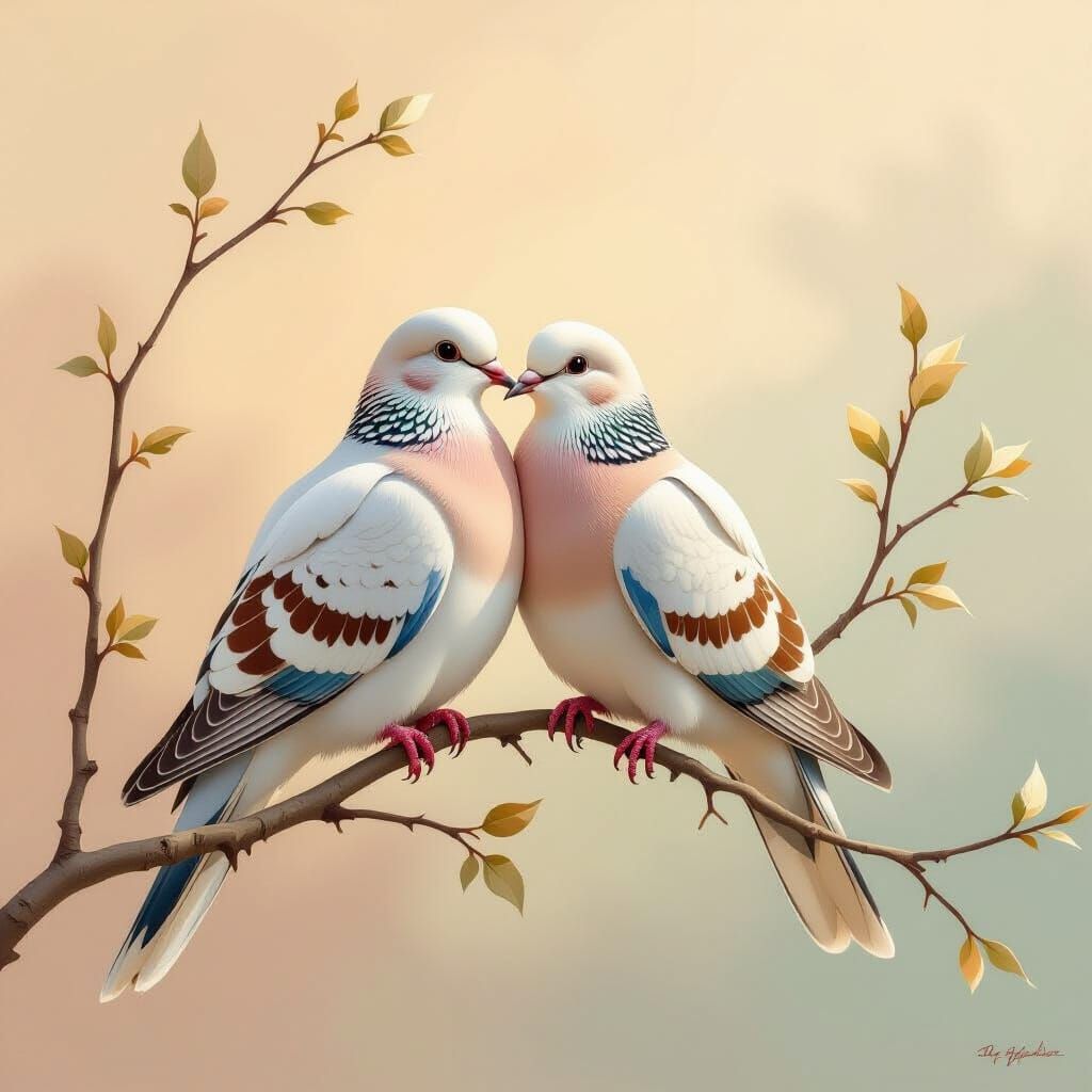 This image shows two doves on a branch, one nuzzling the other. Rendered with intricate details and flowing lines, inspired by Pre-Raphaelite art with soft, pastel lighting.