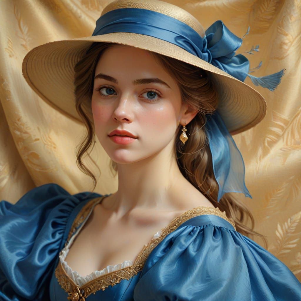 A Renaissance-style portrait of a young woman in a blue gown and floral hat. The image features delicate brushstrokes, soft lighting, and a warm, textured background.