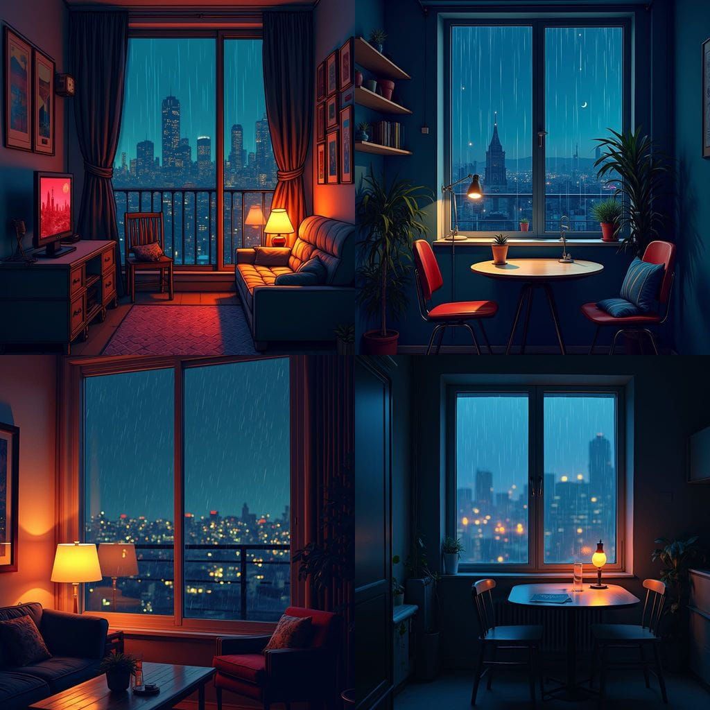 This image shows a small urban apartment at night, illuminated by warm lamps. Outside, rain falls against the window with blurred city lights in the distance. Rendered in a pop art style with triadic colors.