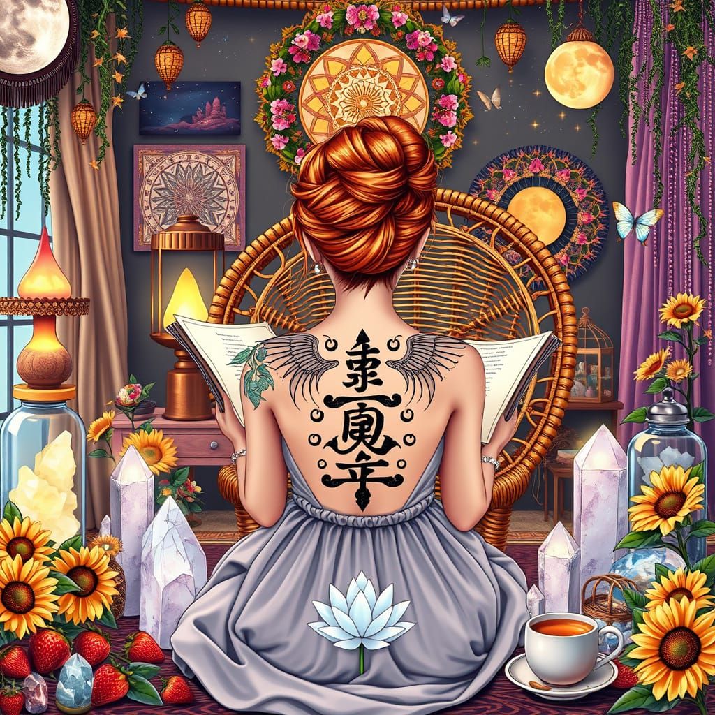 A vibrant pop art image of a girl with an elaborate updo reading scrolls. She sits in a rattan chair surrounded by crystals, flowers, and magical elements, with detailed tattoos visible on her back.