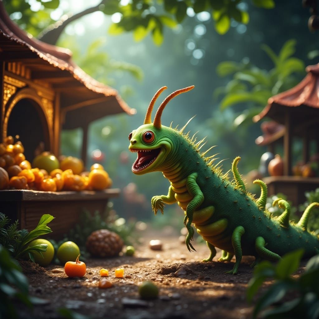 This image features an excited caterpillar at an outdoor food stall, pondering its meal options. The artwork has a whimsical and slightly surreal aesthetic.