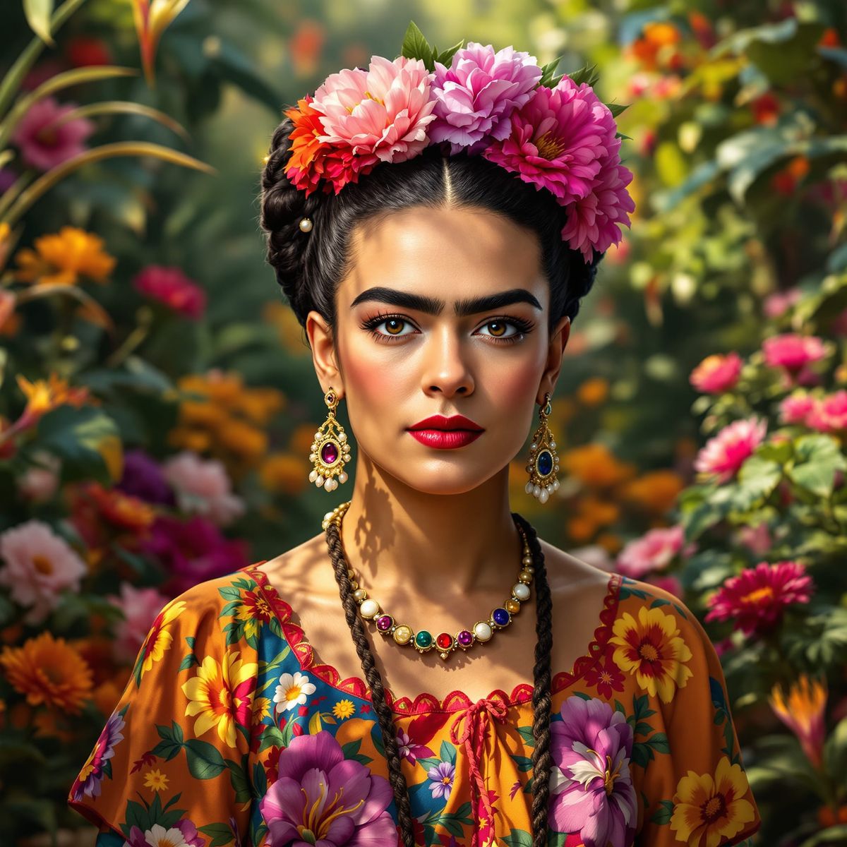A stunning photorealistic portrait of Frida Kahlo with an intense gaze, adorned in a vibrant floral dress. The image features cinematic lighting and rich detail, set against a surreal, lush garden.