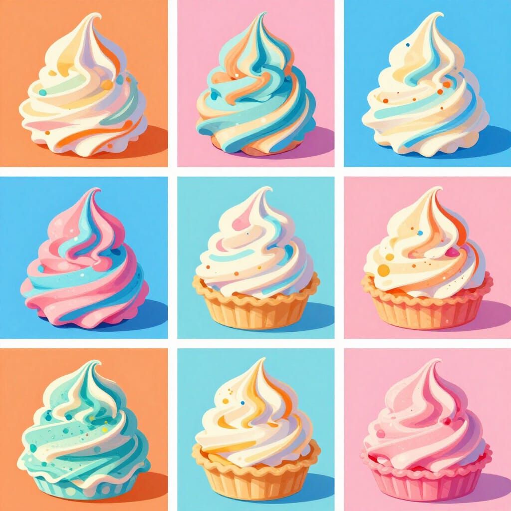 This image features a playful, energetic collage of rainbow sherbet swirls and scoops, showcasing glossy candy and whipped cream textures. It uses a complementary color palette with clean lines and balanced composition.