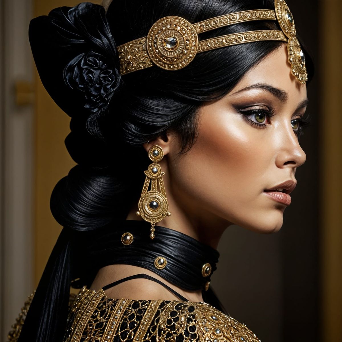 This image showcases a photorealistic depiction of a noblewoman from ancient Iberia, adorned in elegant attire and ornate headpiece, with a focus on intricate details and textures, rendered in a hyperrealistic style inspired by the works of Richard Estes and Ralph Goings, with a touch of atmospheric ligh...