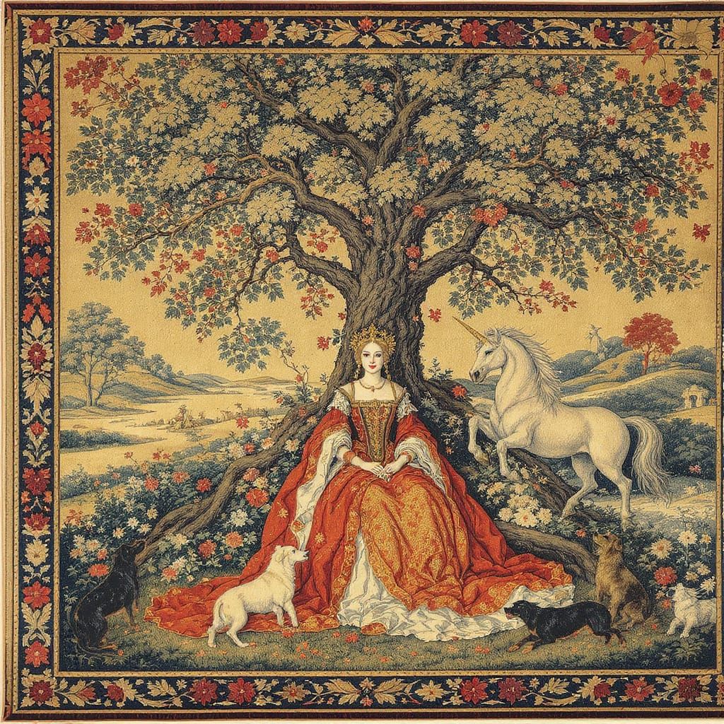 This image shows a Renaissance woman with a unicorn and dogs in a forest. This detailed matte painting is set against a vibrant 17th-century French tapestry with a decorative woven border.