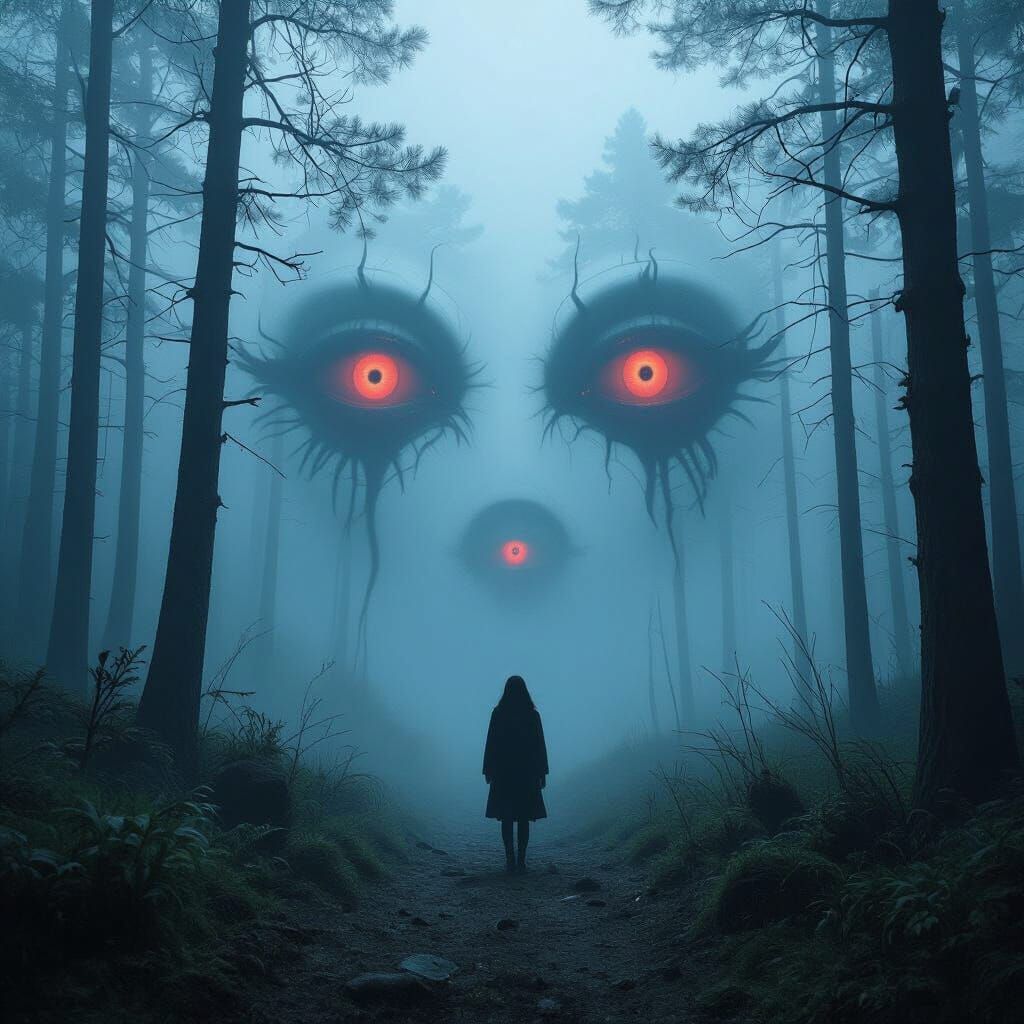 This image shows a frightening scene with glowing red eyes peering through dense trees. A reptilian shadow lurks in the background, with a heavy fog enhancing the Japanese horror aesthetic, as 3D anime art.