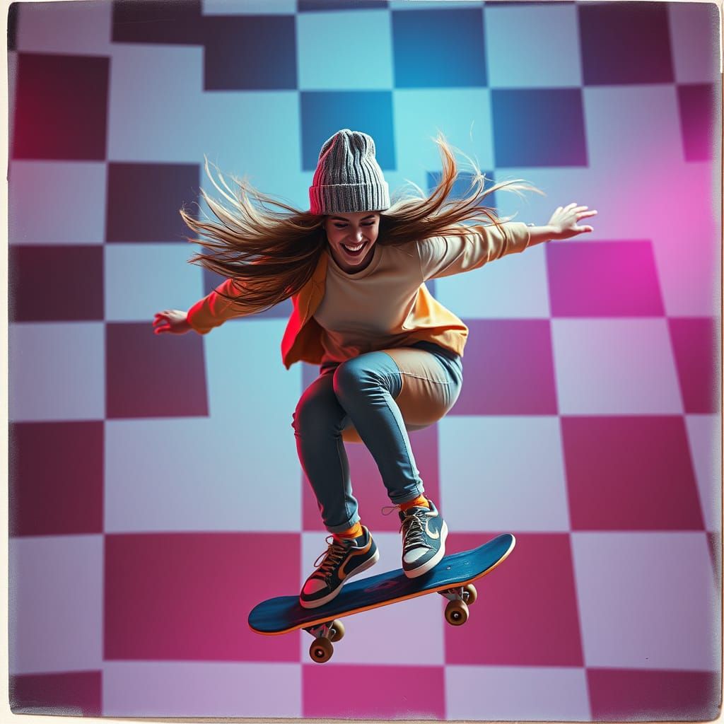 A vibrant image capturing a female skater mid-air. The artwork features wind-swept hair, a beanie, and a checkered backdrop enhanced with neon accents. The overall aesthetic is reminiscent of hyperrealistic digital art with a retro feel.