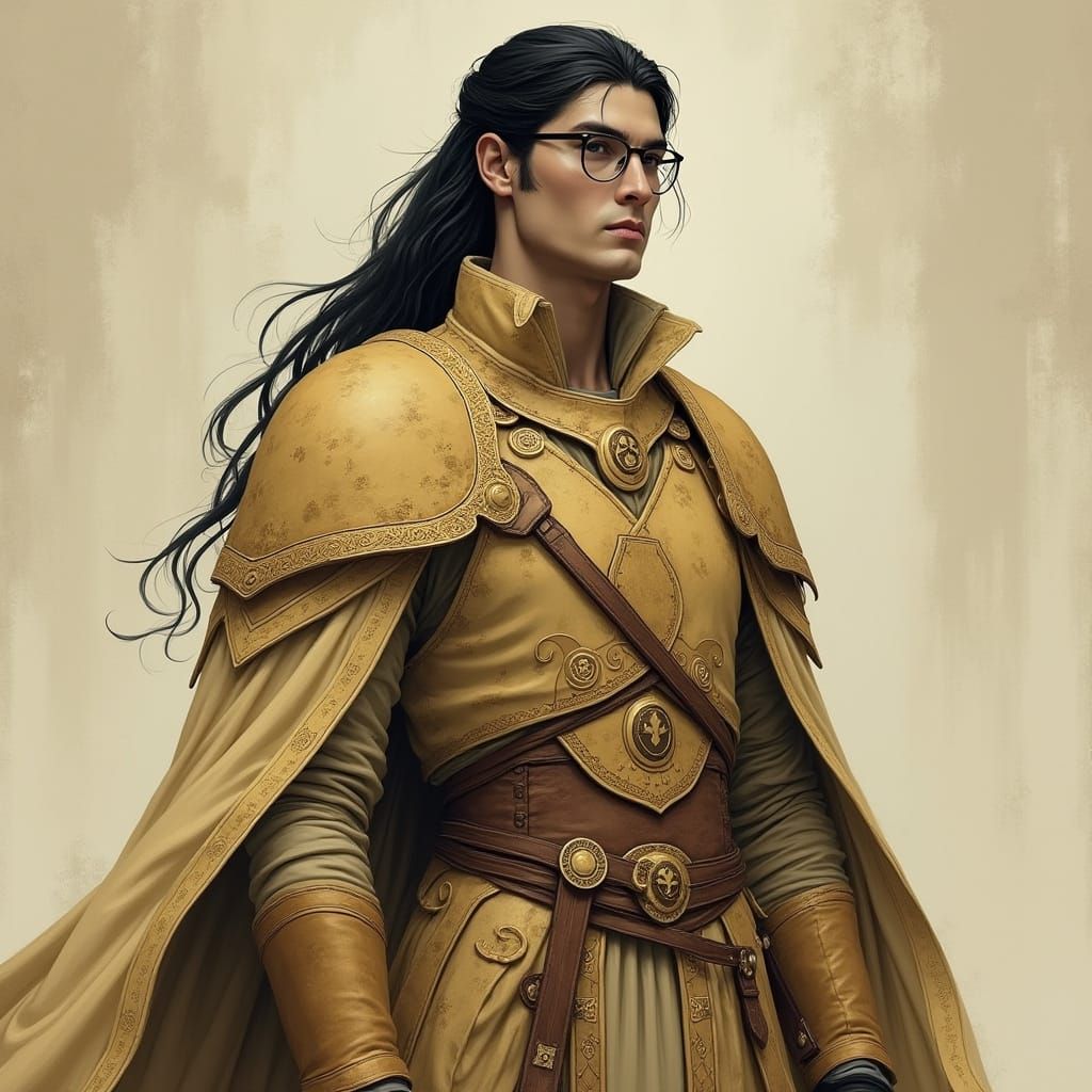 A serene figure in intricately layered armor stands calmly, with enchanted glasses revealing hidden magic and an aura of quiet intensity.