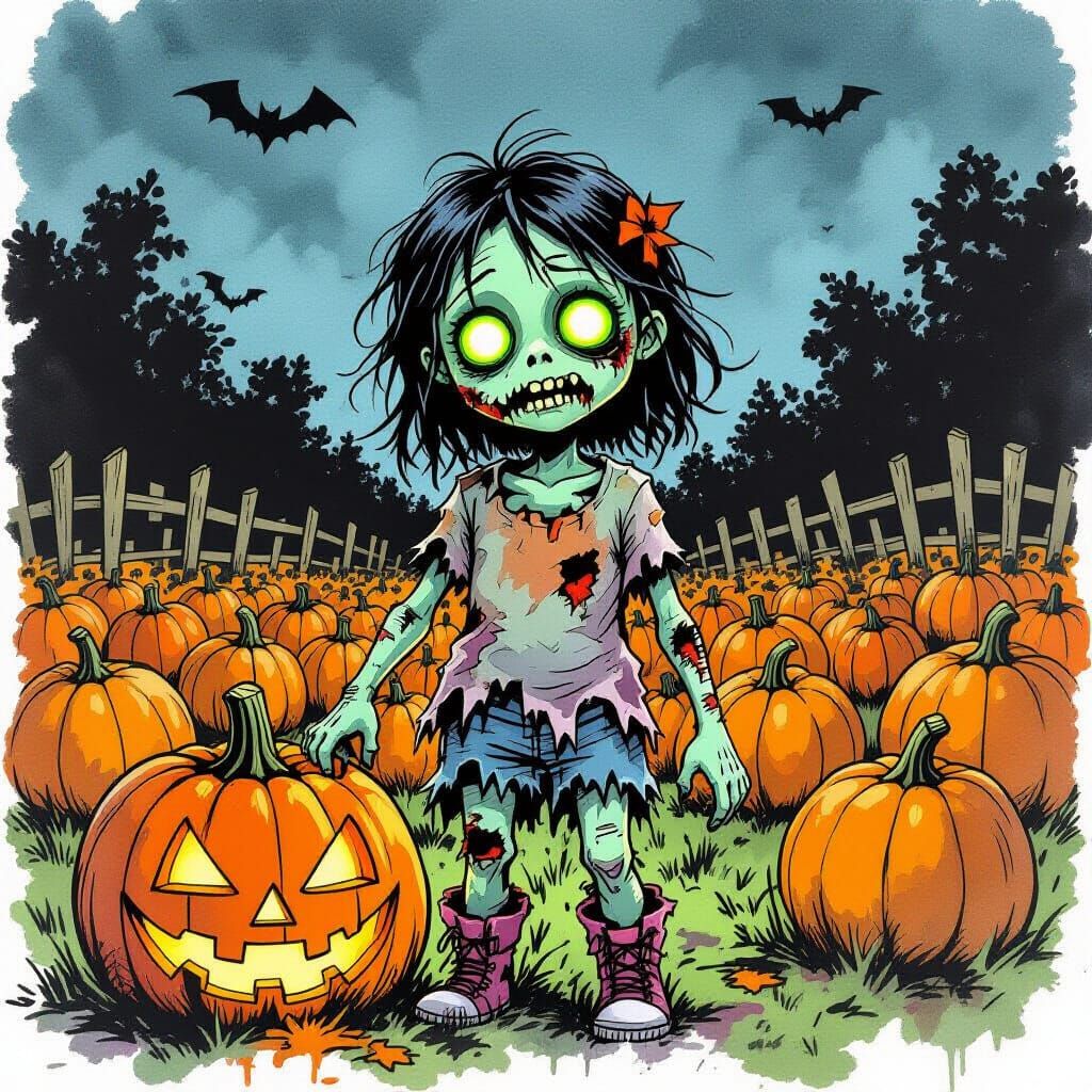 This image shows a young zombie girl in a vibrant pumpkin patch, captured in a loose watercolor comic book style with expressive brushstrokes. The scene evokes a spooky yet whimsical Halloween atmosphere.