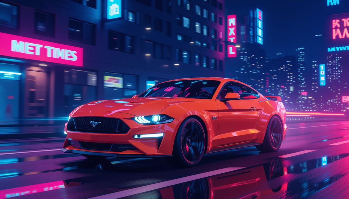 A sleek 3D CGI rendering of an orange Ford Mustang driving fast on a neon-lit city street at night, featuring dynamic lighting and reflective surfaces in a vibrant, cinematic style.