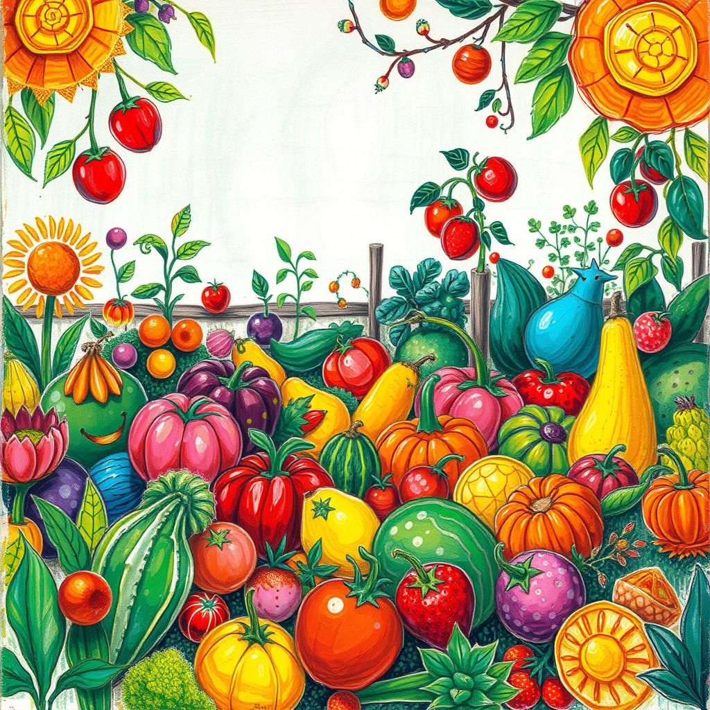 This image is a colorful illustration of a fantastical garden, featuring a variety of fruits and vegetables, created with bold lines and layered textures, giving the impression of a tactile, 3D world.